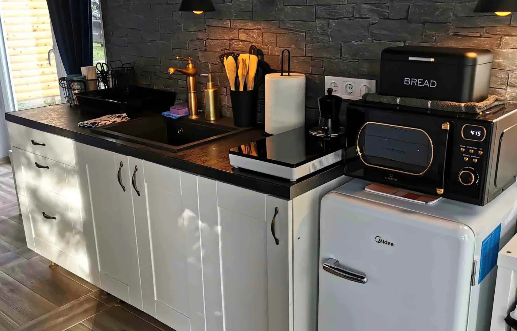 Korszerűen felszerelt konyha (indukciós főzőlap, mikro, hűtőszekrény, kotyogós kávéfőző, kenyérpirító, vízforraló)